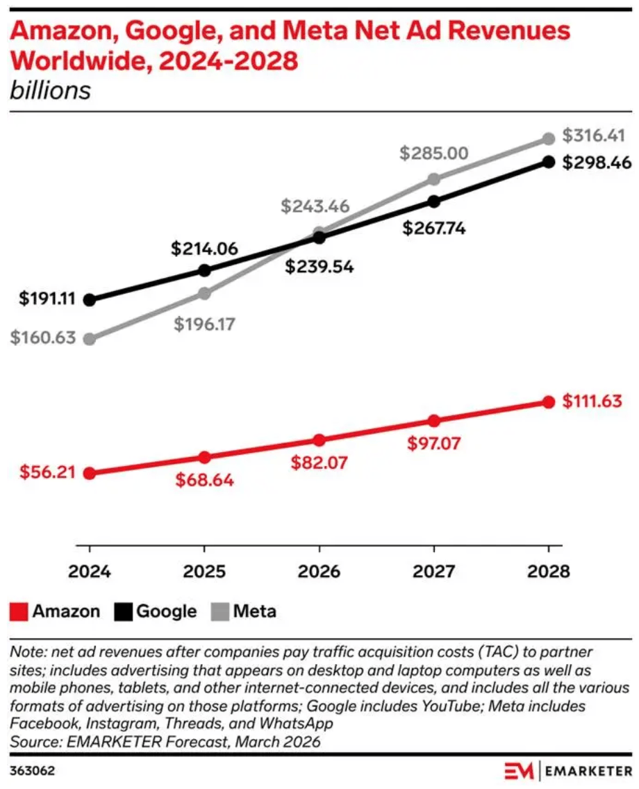 Google is still growing, but at a much slower pace. The bigger takeaway is that advertisers are continuing to put money where performance is strongest. Amazon remains a distant third, but is also gaining share, reinforcing how much digital ad spend is consolidating around a few dominant platforms.